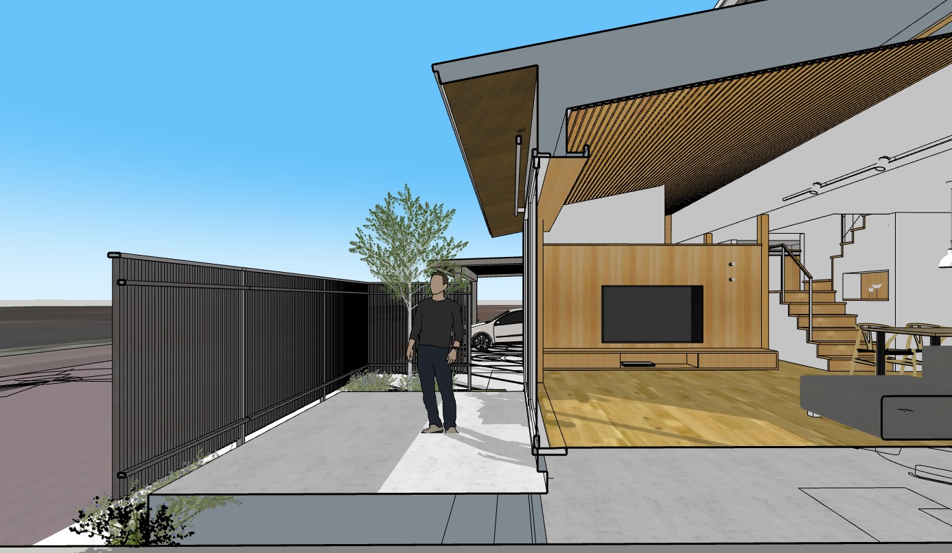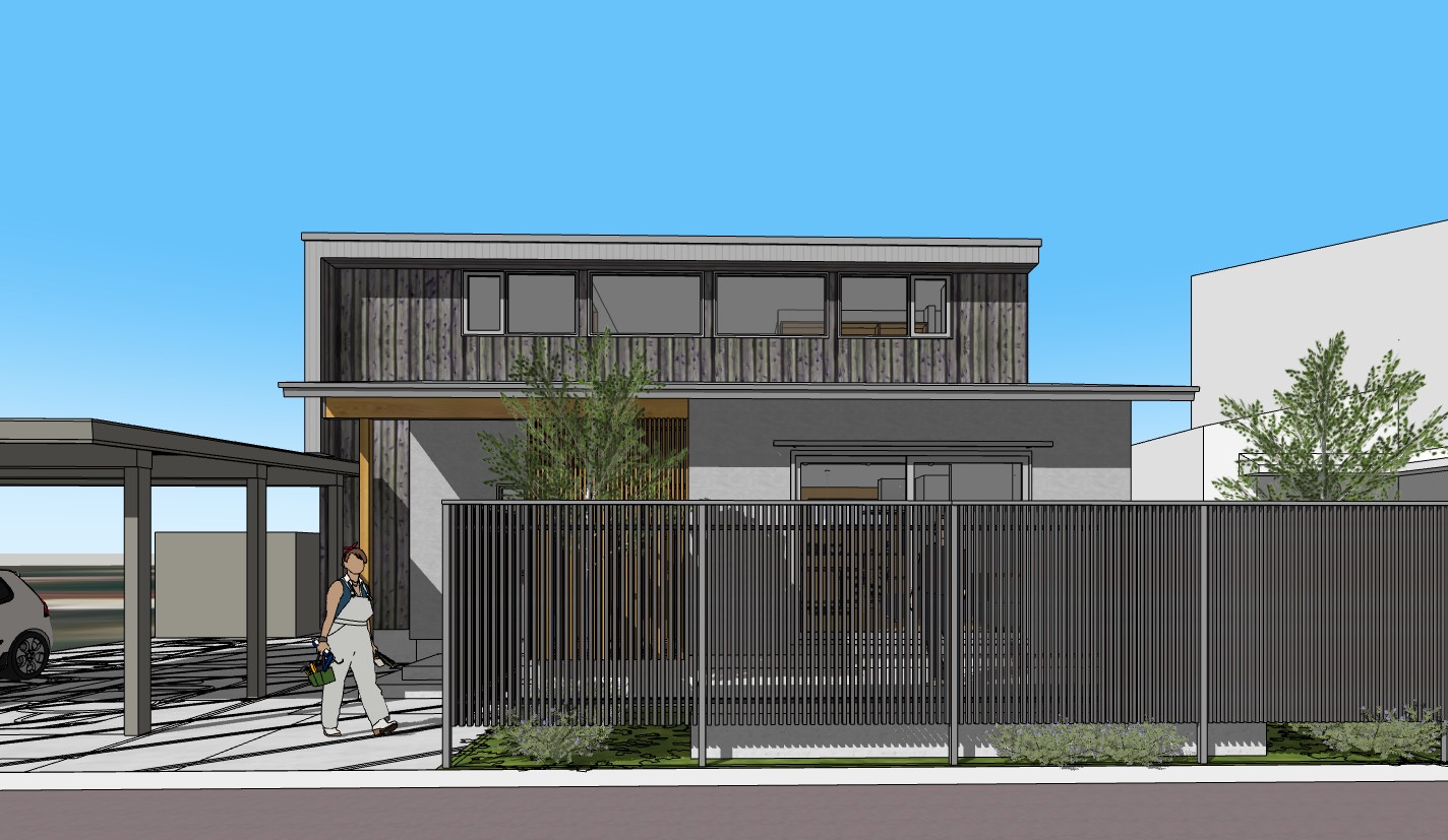 あとは縦格子フェンスとお庭を設ければそれが緩衝地帯となり、