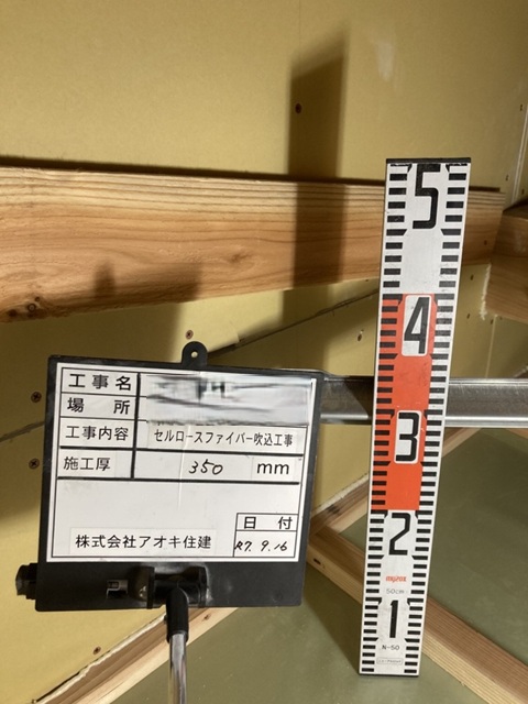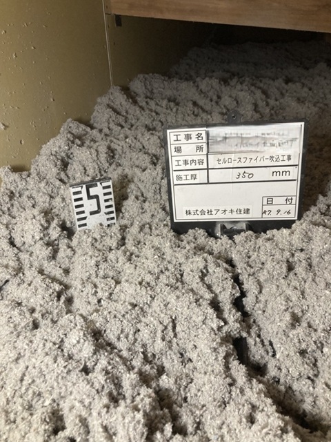 天井の断熱材施工。セルローズファイバー350mm厚。