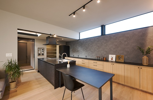 キッチン天板よりも高い位置に棚を設けない低重心設計。