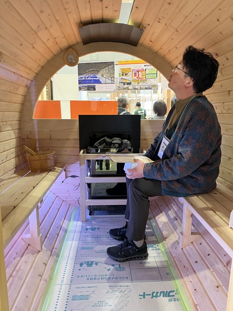 バレルサウナに入ってみる佐藤君。