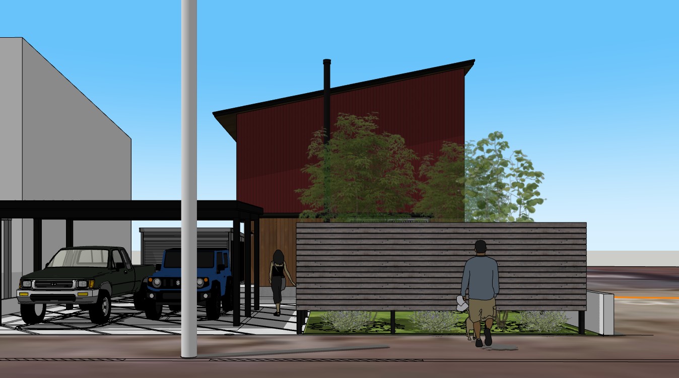 煙突の縦ラインが良いアクセントになっていて、薪ストーブハウス感も強調されていい感じ。