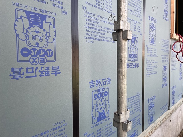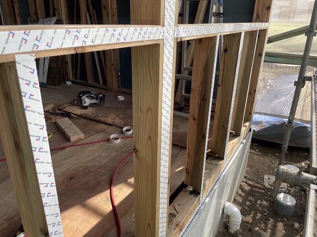 柱や梁の外周面にその制振テープを貼ってから、耐力面材を張っていきます。