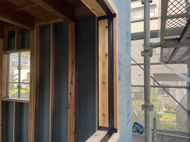 窓まわりの下地木材の隙間もテープ処理。