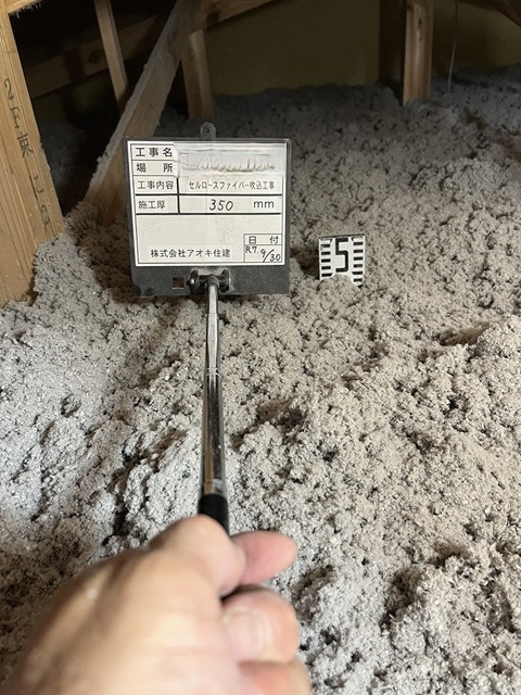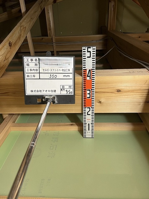 セルローズファイバー吹込。設計値は350mm厚。