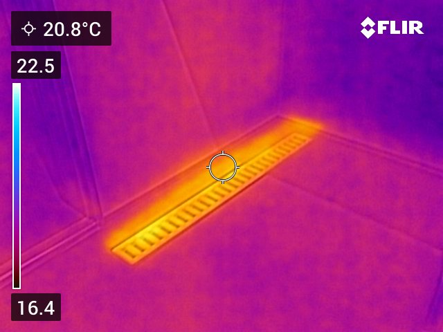 脱衣室床面の吹出口表面温度は22℃ほど。床下エアコンに近い位置なので高めですね。