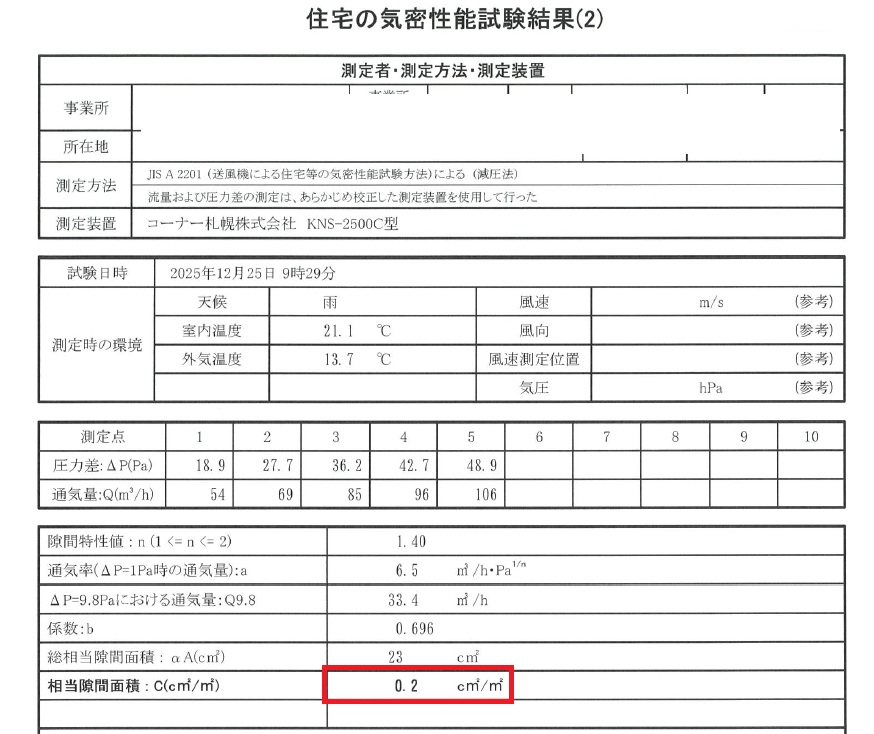 ちなみに竣工時の気密測定結果は下記のとおり。