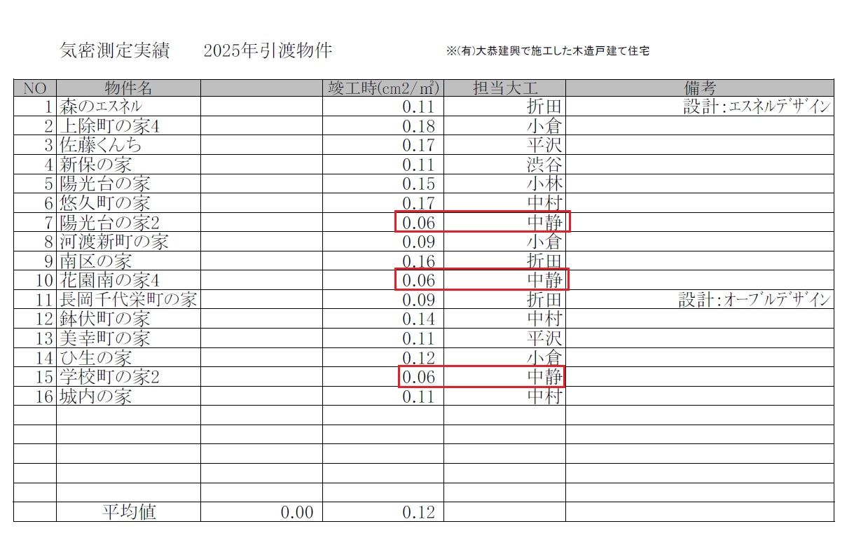 2025年にお引渡となった新築物件は16棟、平均C値は 0.12 cm2/㎡ という結果となりました。