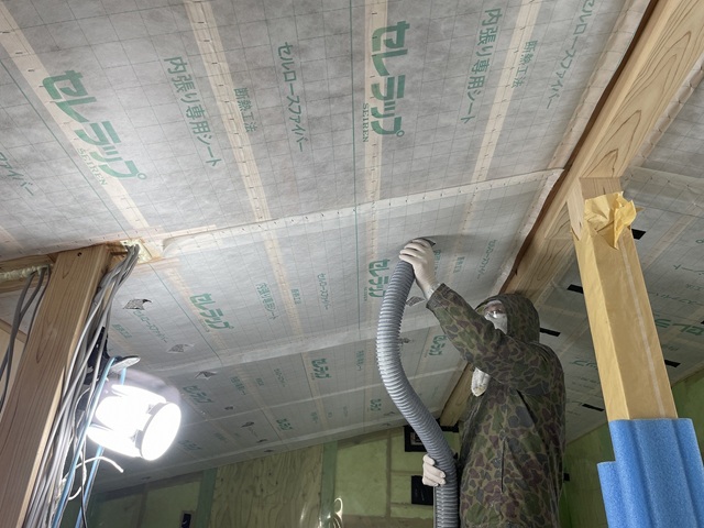 セルローズファイバー吹込み。不織布がパンパンになるまでしっかりと充填。