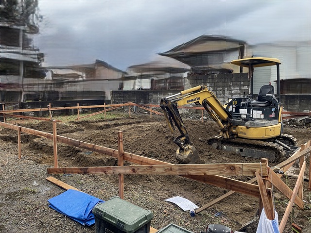 やり方設置 ~ 掘削 ~ 砕石敷均し ~ 防湿シート敷設 ~ 捨てコンクリート打設 ~