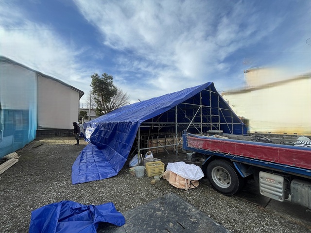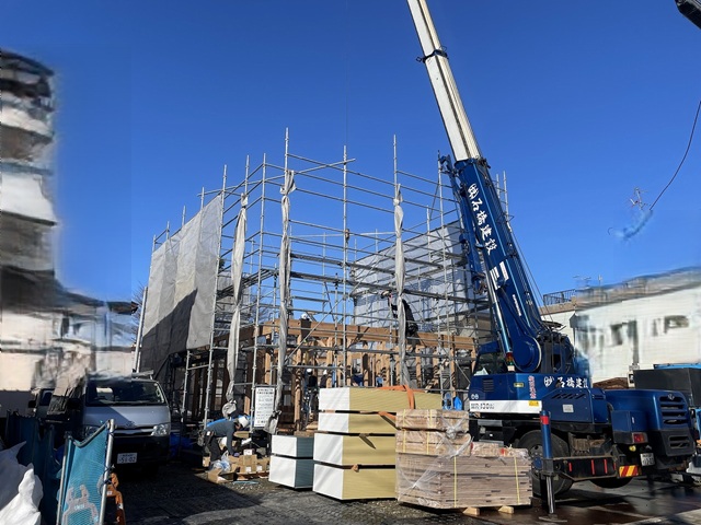 建て方作業当日、新潟の冬とは思えない青空でした。