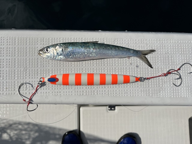 船上でマダラが吐き出したイワシ。