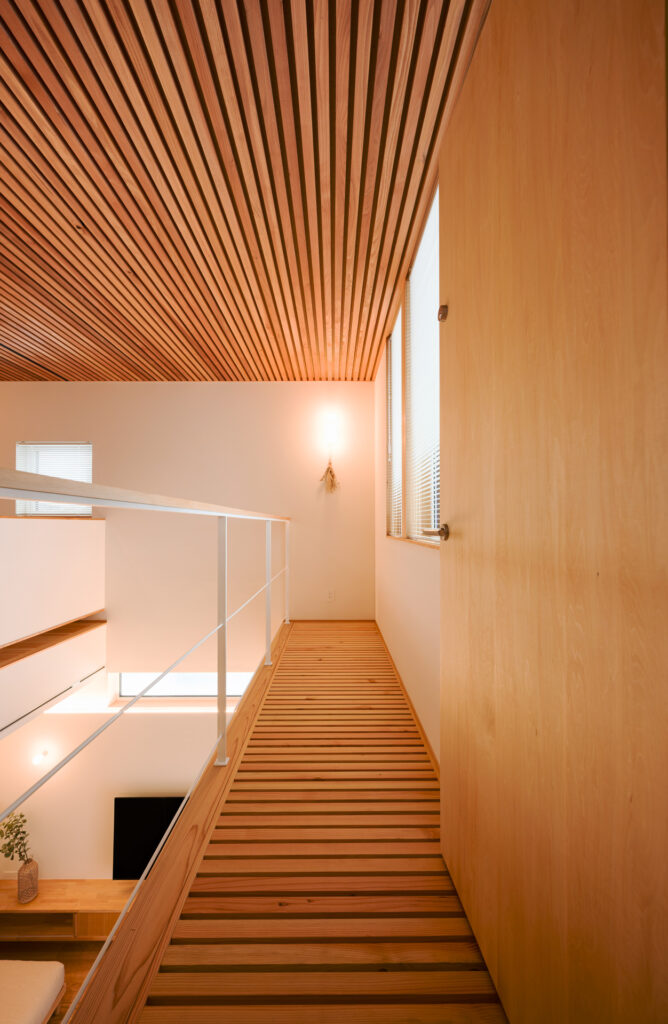 目隠しフェンスで囲ったプライベートテラスと、光を落とす大きな吹抜け。