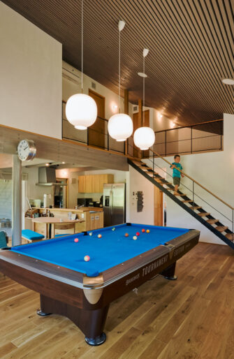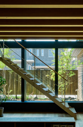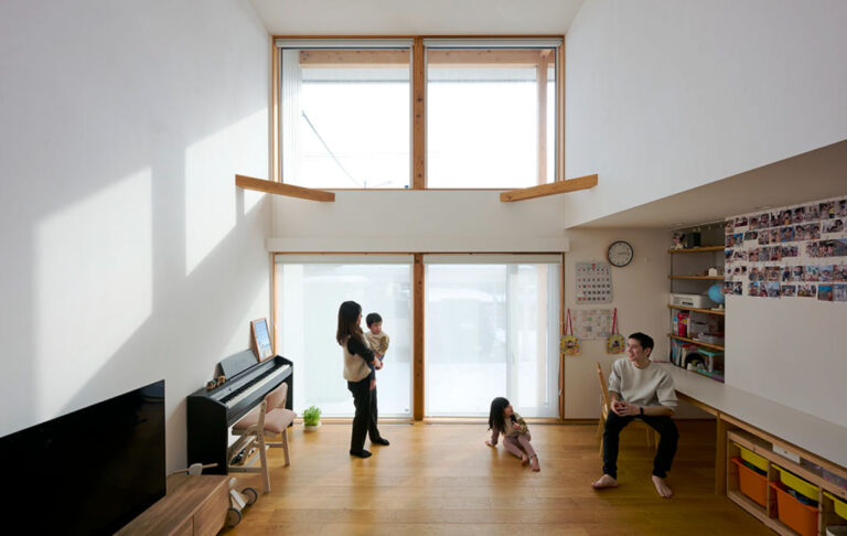 深い軒と袖壁に囲まれたスクエアな外観は、無垢の白木と白い窓枠によって明るい雰囲気が漂う。 室内に入ると、吹き抜けのリビングには上からも正面からも陽光が壁へ、床へ。 光と温もりに包まれる。