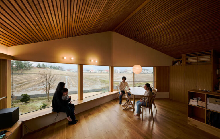 開けた景色に向かって三角にせり出す窓。その姿は、田園へと向かって漕ぎ出す船のようにも見える。 室内はといえば、景色を取り込みつつ日差しが操作され、心地よい温度感に満ちていた。